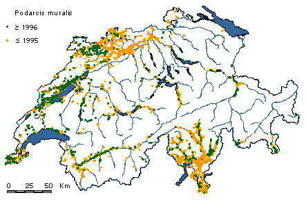 Southern Switzerland (Ticino, southern Grisons) and Western Switzerland (Rhone Valley, Lake Geneva area, the south slopes of the Jura up to Basel, and along the Rhine river). Isolated populations in central and eastern Switzerland (Goldau, Frauenfeld, Zurich, Romanshorn) are probably introduced.