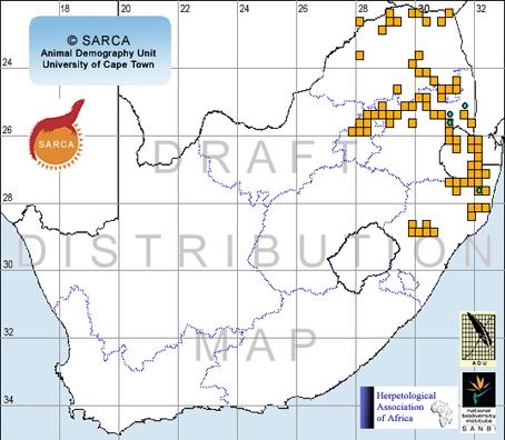 Occurs in the lowveld and Lubombo regions, absent from the highveld and middleveld. Previously unrecorded, currently four localities recorded. Also an additional sight record.