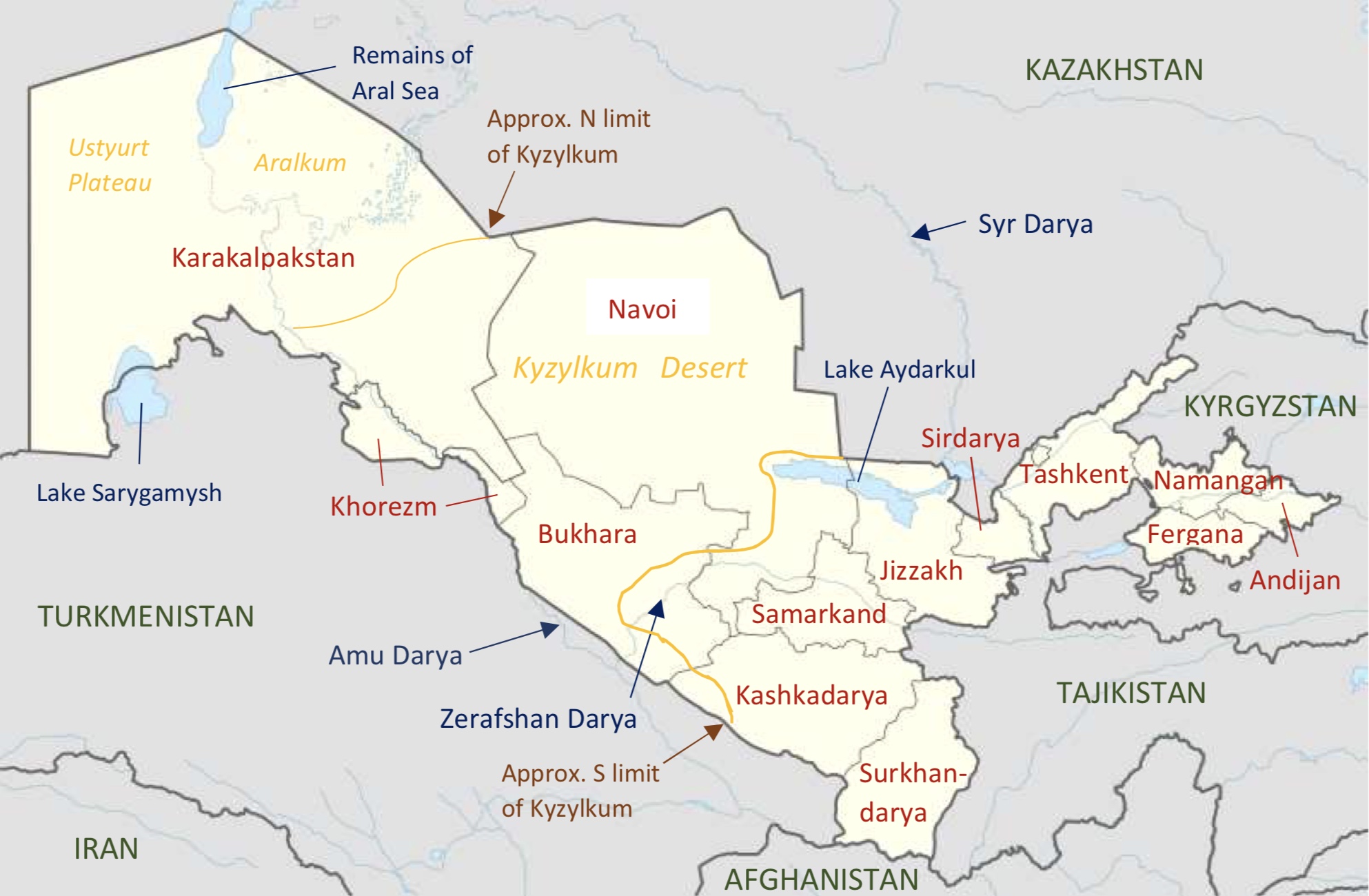 Widespread around the Aral Sea periphery, on the Amu Darya deltaic plain and along the river valley. Mostly absent from the Ustyurt Plateau but in S Ustyurt reported from the Shakhpakhty area, Assake-Audan depression and Sarygamysh depression, Kungirot (Qo’n’irat) district. Few records from the N Kyzylkum but fairly widespread in scrub semi-desert (including vegetated takyrs) of the C Kyzylkum. Appears unrecorded from the Sundukli Sands within Uzbekistan but documented in adjacent Turkmenistan. Also present in S (south to S Surkhandarya) and through SE and E.